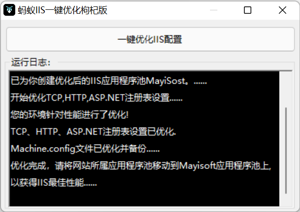 首先我们得用到“IIS性能一键优化工具”软件【点击下载】,现在后使用管理员权限运行打开,执行一键优化,优化成功后如下图: