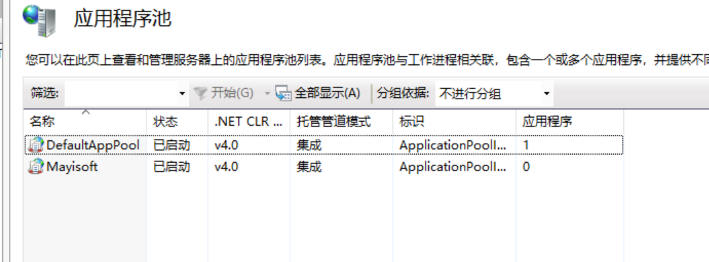 优化成功后,IIS7以上会自动创建一个名为"Mayisoft"的应用程序池,如图: