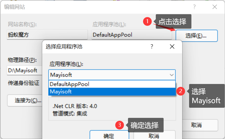 我们需要将网站所属应用程序池应用到“Mayisoft”上,如图: